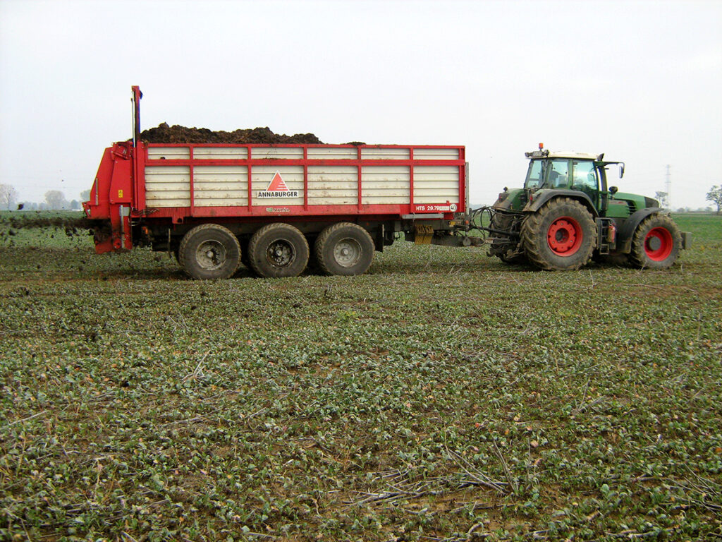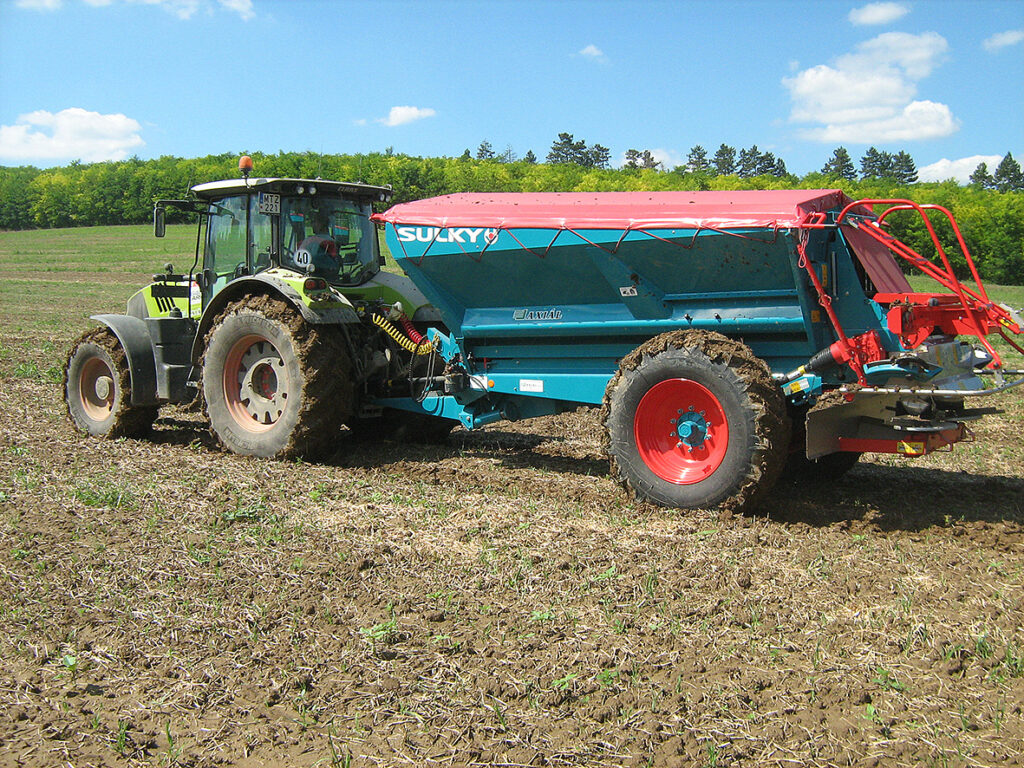 Tridem futóműves trágyaszóró munka közben