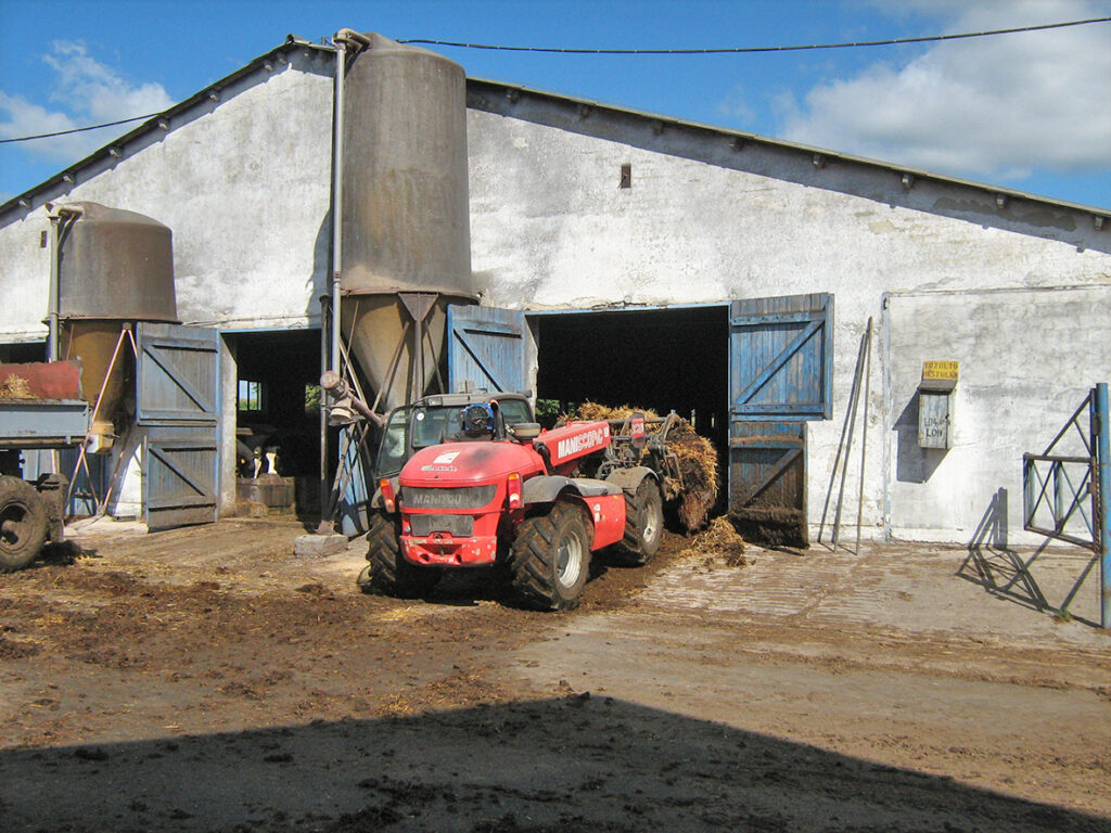 Trágyavillával szerelt teleszkópos rakodó kitrágyázásban