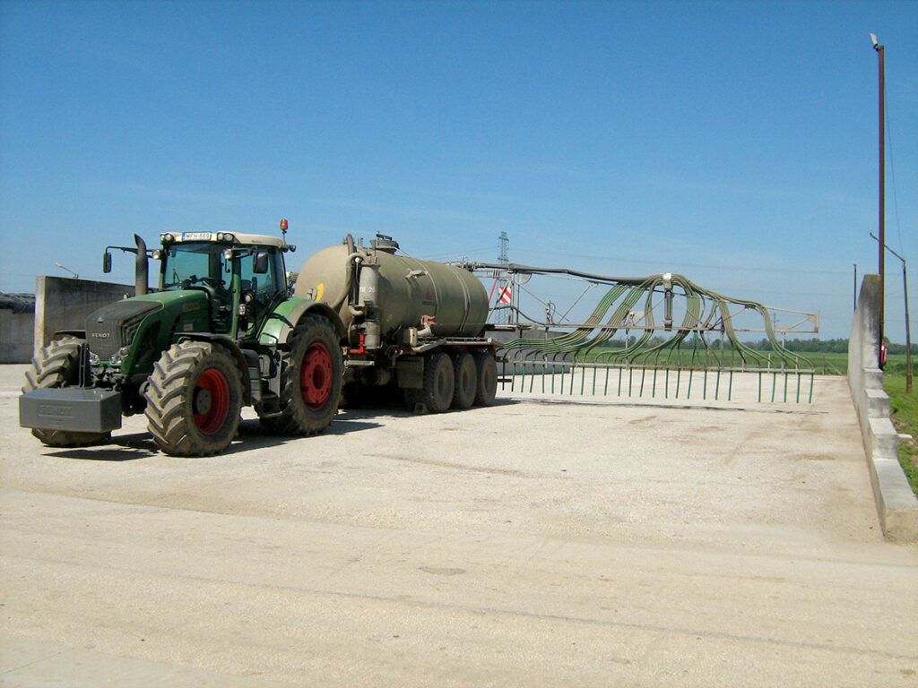 A hígtrágya területen történő kijuttatása történhet szórófejekkel felszíni kiszórással, vagy talajba juttatással. A 12%-nál nagyobb lejtős területen a kijuttatás csak csúszócsoroszlyás, vagy egyéb talajba juttató adapterrel végezhető el. (7.-8.ábra) A tartálykocsis szállítás, vagy szivattyúval történő szállítás esetén a szántóföldön elhelyezett átmeneti tároló konténerek feltöltése is elvégezhető. A konténertől, illetve akár a közeli tárolóból szivattyúval, a területen mozgó traktorra szerelt adapterhez csővezetéken szállítható a hígtrágya. Ezt a módszert nevezhetjük köldökcsöves kijuttatási-, talajba juttatási technológiának. (9. ábra)