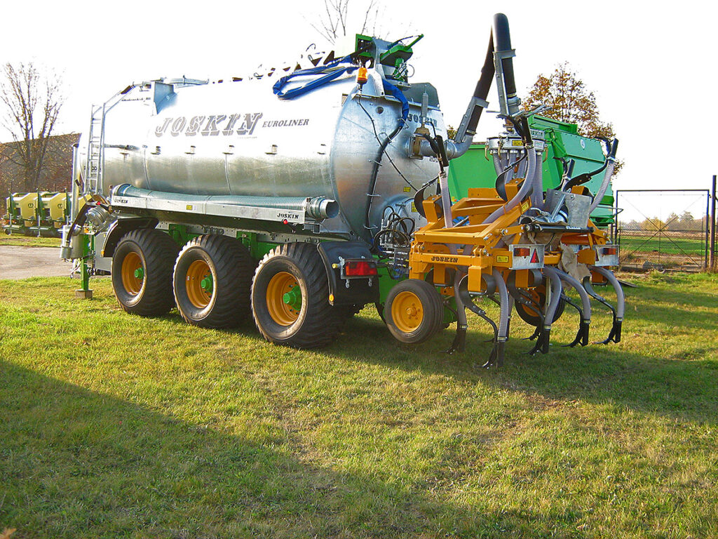 A hígtrágya kijuttatása az előzőekhez hasonló logisztikával, de attól bonyolultabban oldható meg. A hígtrágya hasznosításának-, kijuttatásának legegyszerűbb módja a csővezetéken történő szállítás, és síkterületen cserélhető-, vagy lineár esőztető öntözőberendezésekkel történő kijuttatás. A hazai mezőgazdasági gyakorlatban azonban a leggyakoribb üzemi megoldás a tengelyen történő tartálykocsis szállítás. (8. ábra) A tartálykocsik alváz futómű kialakítása az előzőekben ismertetettekkel megegyező. A tartályok kialakítása – anyagukat tekintve – lehetnek acélból-, vagy műanyagból, poliészterből kialakítottak. A kompresszoros tartálykocsiknál a töltés vákuummal, az ürítés nyomás alatt történik. Ezért ezek nyomástartó edények.